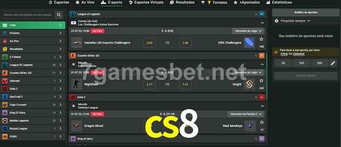 O cs8 oferece uma grande seleção de opções de apostas em e-sports com probabilidades competitivas